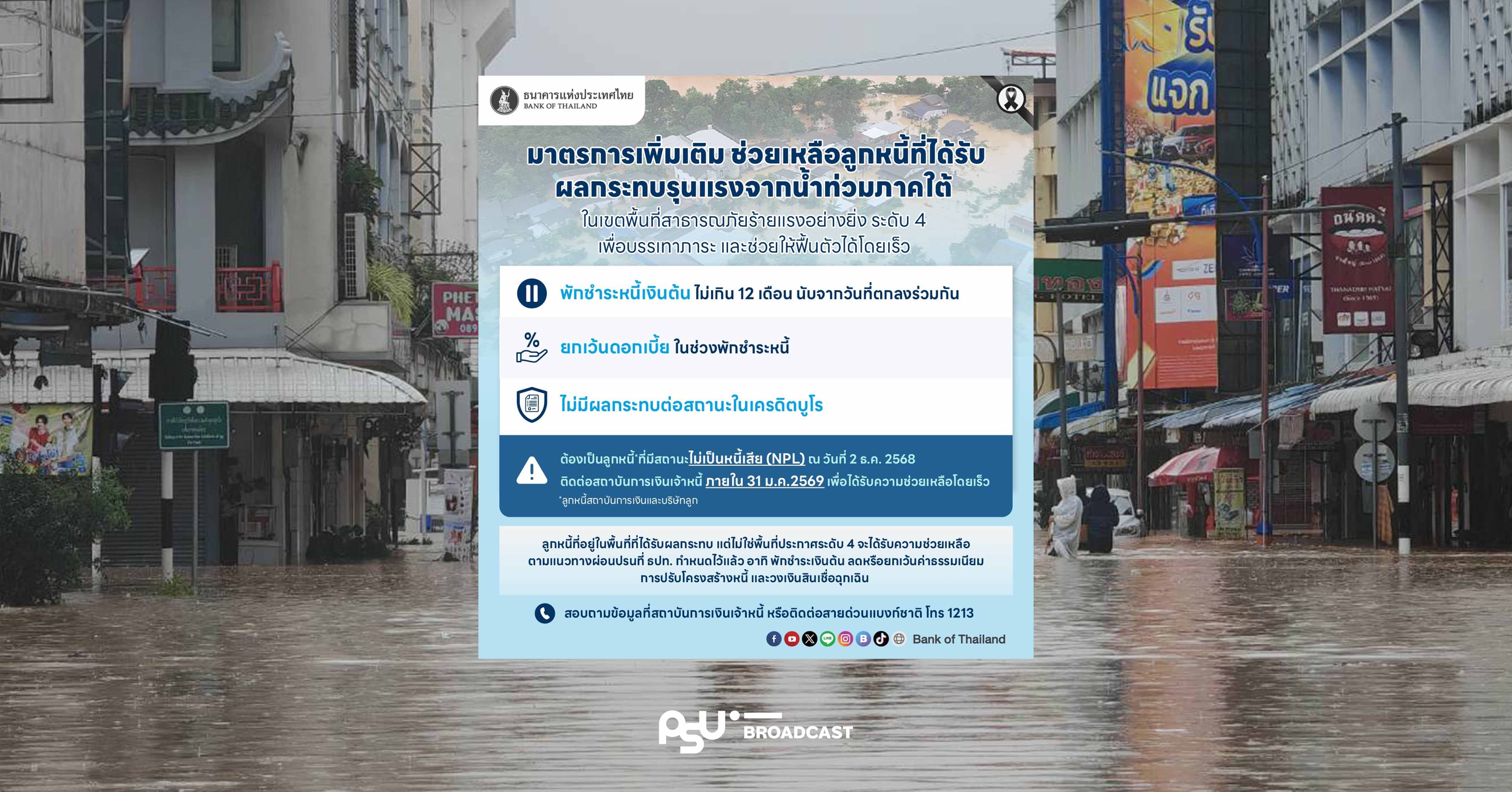 นายพสุธา ระวังสุข รองผู้อำนวยการธนาคารแห่งประเทศไทย สำนักงานภาคใต้ กล่าวถึงมาตรการช่วยเหลือลูกหนี้ที่ได้รับผลกระทบรุนแรงจากอุทกภัยในภาคใต้ ในรายการแลบ้านแลเมืองว่า โดยปกติแล้ว ธนาคารและสถาบันการเงินมีนโยบายในการออกมาตรการช่วยเหลือทั่วไปเมื่อเกิดสาธารณภัยอยู่แล้ว แต่ในกรณีของอุทกภัยจังหวัดสงขลา ที่ถูกประกาศเป็นพื้นที่สาธารณภัยอย่างยิ่ง ระดับ 4 ทางธนาคารแห่งประเทศไทยร่วมกับสมาคมธนาคารไทย เห็นควรให้มีการผลักดันมาตรการทางการเงินเพื่อช่วยเหลือลูกหนี้อย่างพอเพียงและตรงจุดมากขึ้น โดยมาตรการช่วยเหลือเพิ่มเติมดังกล่าว ได้แก่ การพักชำระหนี้เงินต้นและงดเว้นดอกเบี้ยในระหว่างการพักชำระ นานสูงสุด 12 เดือน โดยไม่กระทบต่อเครดิตบูโร สำหรับผู้ที่ประสงค์รับความช่วยเหลือ สามารถติดต่อธนาคารฯ และสมัครเข้าร่วมโครงการ ได้ตั้งแต่วันนี้ถึงวันที่ 31 มกราคม 2569
