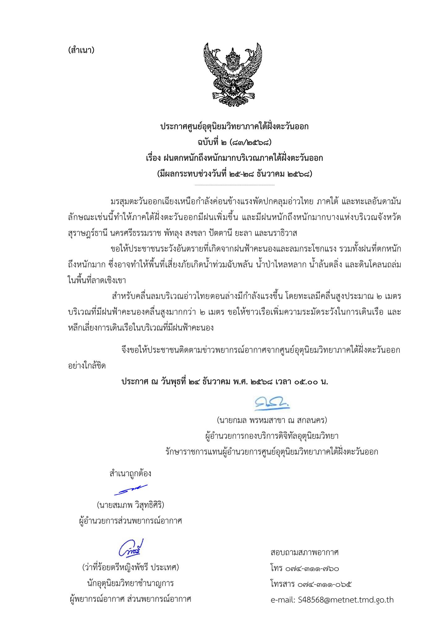 เนื่องจากมรสุมตะวันออกเฉียงเหนือกำลังค่อนข้างแรงพักปกคลุมอ่าวไทย ภาคใต้ และทะเลอันดามัน ลักษณะเช่นนี้ทำให้ภาคใต้ฝั่งตะวันออกมีฝนเพิ่มขึ้น และมีฝนหนักถึงหนักมากบางแห่งบริเวณจังหวัดจังหวัดสุราษฎร์ธานี นครศรีธรรมราช พัทลุง สงขลา ปัตตานี ยะลา และ นราธิวาส ขอให้ประชาชนระวังอันตรายที่เกิดจากฝนฟ้าคะนองและลมกระโชกแรง รวมทั้งฝนที่ตกหนักถึงหนักมาก ซึ่งอาจทำให้พื้นที่เสี่ยงภัยเกิดน้ำท่วมฉับพลัน น้ำป่าไหลหลาก น้ำล้นตลิ่ง และดินโคลนถล่มในพื้นที่ลาดเชิงเขา คลื่นลมบริเวณอ่าวไทยตอนล่างมีกำลังแรงขึ้น โดยทะเลมีคลื่นสูงประมาณ 2 เมตร บริเวณที่มีฝนฟ้าคะนองคลื่นสูงมากกว่า 2 เมตร ขอให้ชาวเรือเพิ่มความระมัดระวังในการเดินเรือ และหลีกเลี่ยงการเดินเรือในบริเวณที่มีฝนฟ้าคะนอง ขอให้ประชาชนติดตามข่าวพยากรณ์อากาศจากศูนย์อุตุนิยมวิทยาภาคใต้ฝั่งตะวันออกอย่างใกล้ชิด