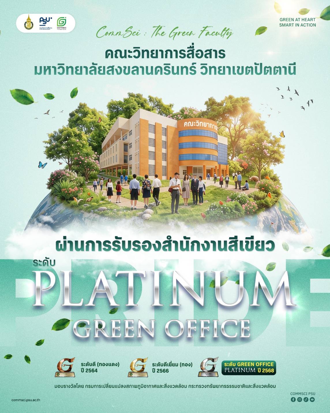 ตามที่กรมการเปลี่ยนแปลงสภาพภูมิอากาศและสิ่งแวดล้อม กระทรวงทรัพยากรธรรมชาติและสิ่งแวดล้อมได้แจ้งรายชื่อหน่วยงานที่ผ่านการรับรองสำนักงานสีเขียว (Green Office) ปี 2568 จำนวน 123 แห่ง คณะวิทยาการสื่อสาร มหาวิทยาลัยสงขลานครินทร์ วิทยาเขตปัตตานี ได้รับการับการรองสำนักงานสีเขียว ระดับ Green Office Platinum ประจำปี 2568 โดยหน่วยงานที่ได้รับการรับรองในระดับ Platinum ประกอบด้วย คณะวิทยาการสื่อสาร มหาวิทยาลัยสงขลานครินทร์ วิทยาเขตปัตตานี, คณะสถาปัตยกรรมศาสตร์ มหาวิทยาลัยเกษตรศาสตร์, และบริษัท ปตท.สำรวจและผลิตปิโตรเลียม จำกัด (มหาชน)